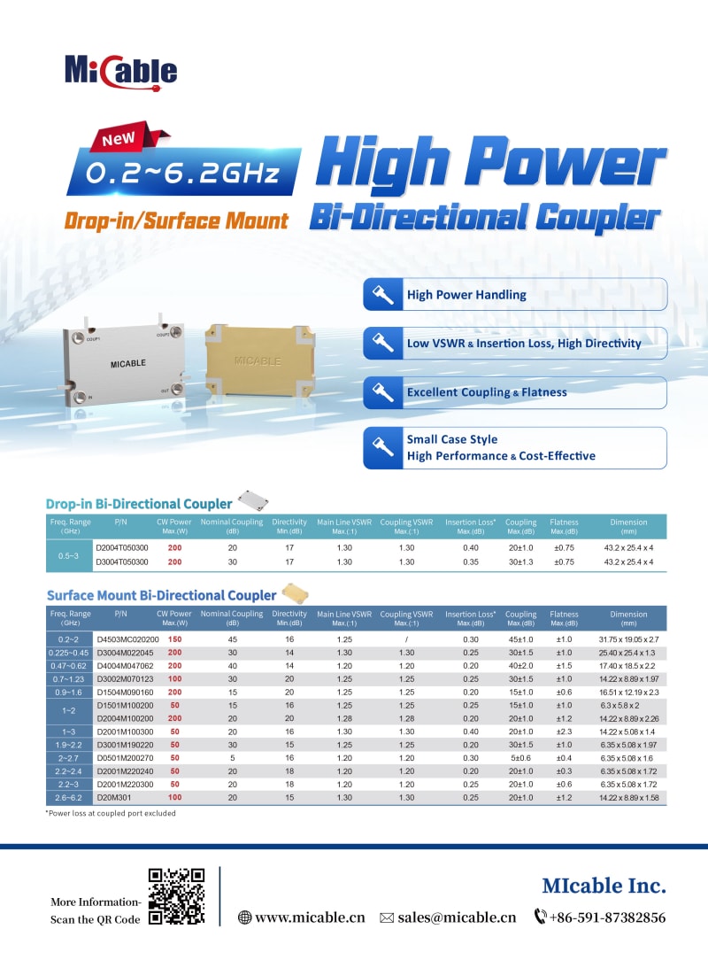 MIcable just released the new drop-in & surface mount bi-directional couplers. The coupling covers 5~45dB, frequency covers 0.2~6.2GHz. lt has 200W power handling capability with excellent stability and heat dissipation ability in a small package. It can realize the functions of power dividing and combining, signal acquisition. It is suitable for active phased array radar, power amplifier, radio and satellite communication, etc.