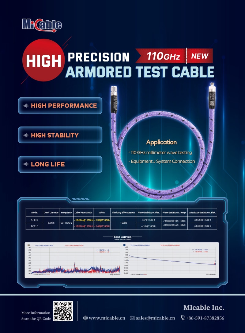 MIcable AT110 series armored precision test cable uses low loss, phase and amplitude stable cable, coupled with multi-layer composite armor protection. It has excellent mechanical properties in reliable structure, water and oil proof, abrasion, compression and torsion resistance, and good durability, as well as excellent electrical performance in low VSWR, low loss, high shielding effectiveness, and stable amplitude and phase, especially in the room temperature range (-10 ℃~+30 ℃), the phase change rate is less than 100ppm. It is your ideal choice for the testing of 110GHz products in laboratory and production line.