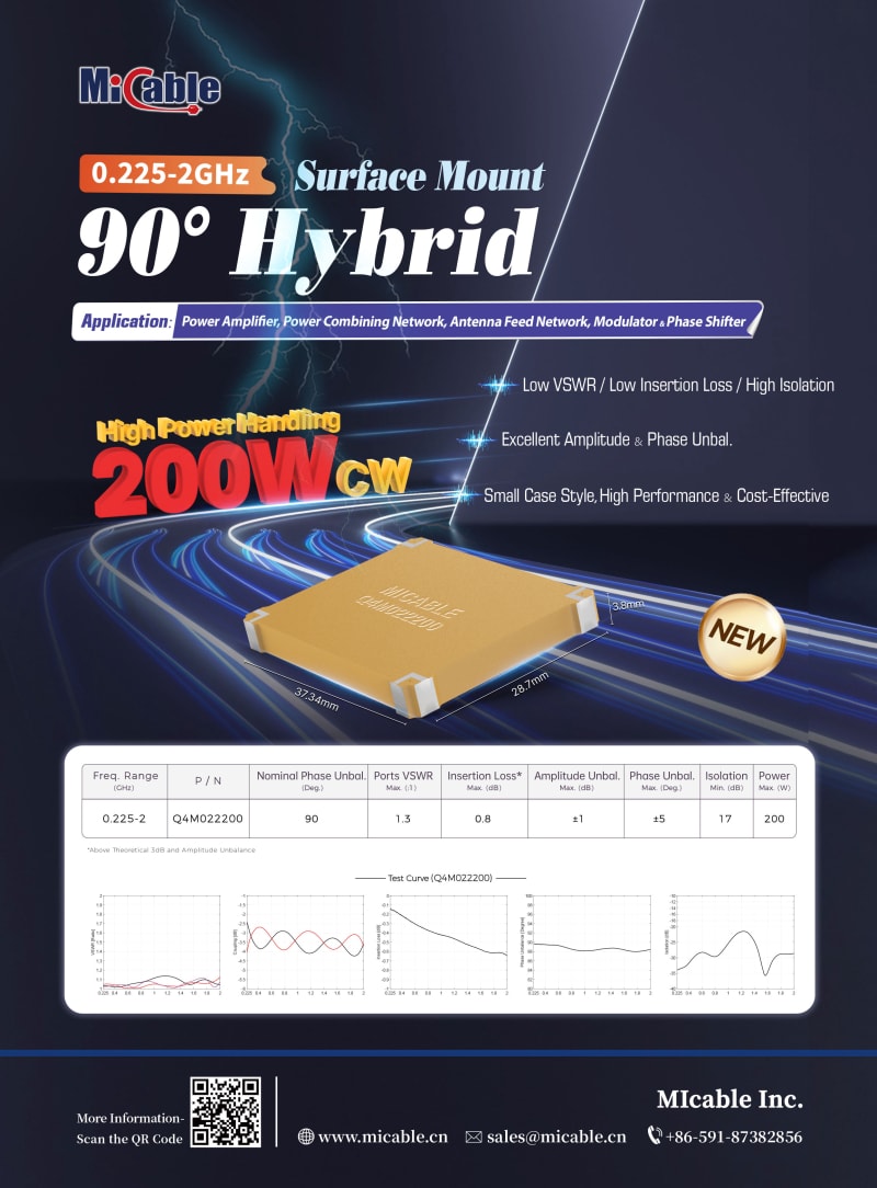 Mlcable just released the new 0.225~2GHz high power surface mount 90° hybrid. It has low insertion loss (0.8dB Max.), excellent VSWR (1.30:1 Max.), extremely good amplitude unbalance (±1dB Max.) & phase unbalance (±5° Max.), high isolation (17dB Min.) and 200W power handling capability with excellent stability and heat dissipation ability in a small package. It is suitable for power amplifier, power combining network, antenna feed network, modulator and phase shifter applications.