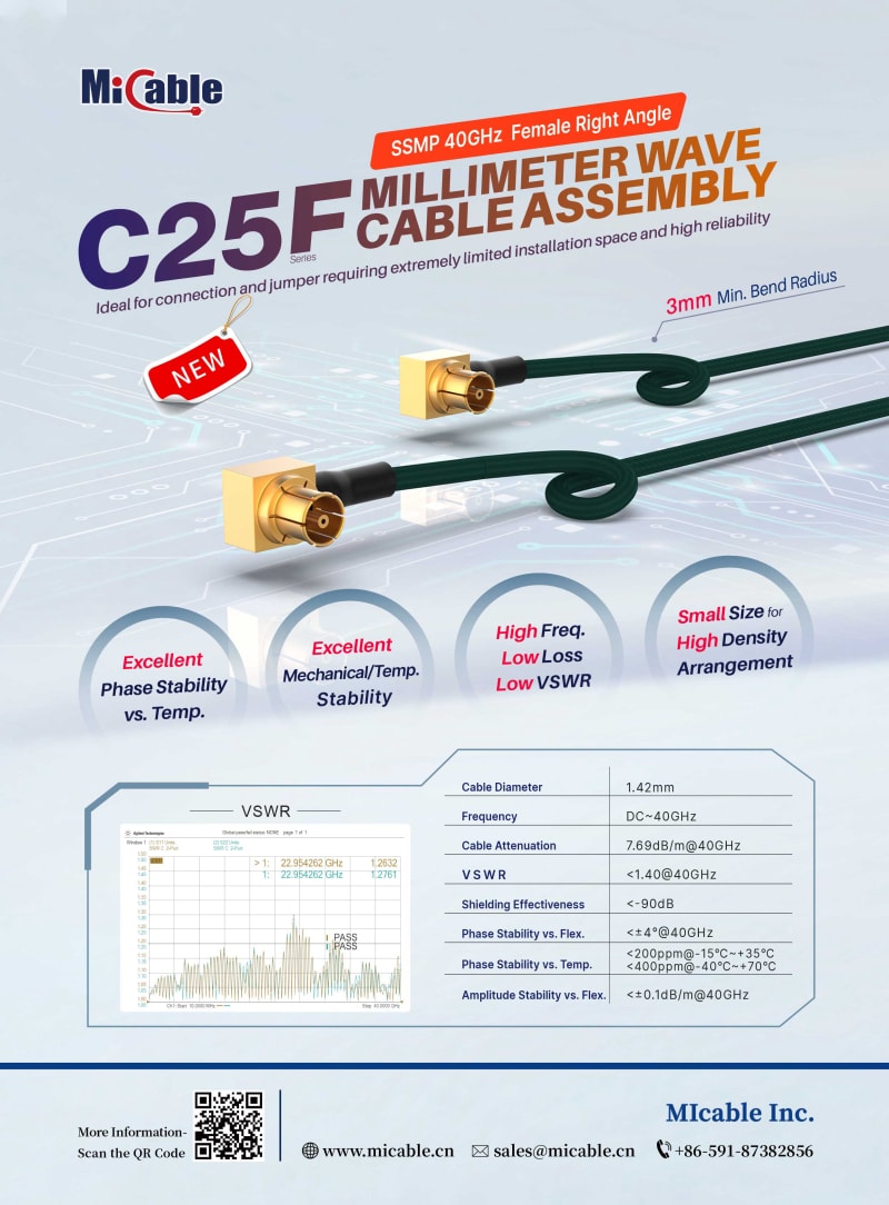 The C25F SSMP 40GHz female right angle millimeter wave cable assembly adopts ultra-fine low loss 047 flexible phase stable cable and small-size SSMP female right angle connectors, which is extremely suitable for high density arrangement. The product has the characteristics of high frequency, low loss, low WSWR, and excellent amplitude and phase stability, especially phase change rate <200PPM@-15 ~+35℃ and <400PPM@40 ~+70℃, it’s highly suitable for miniaturized integrated applications with high requirements for amplitude/phase consistency and stability.