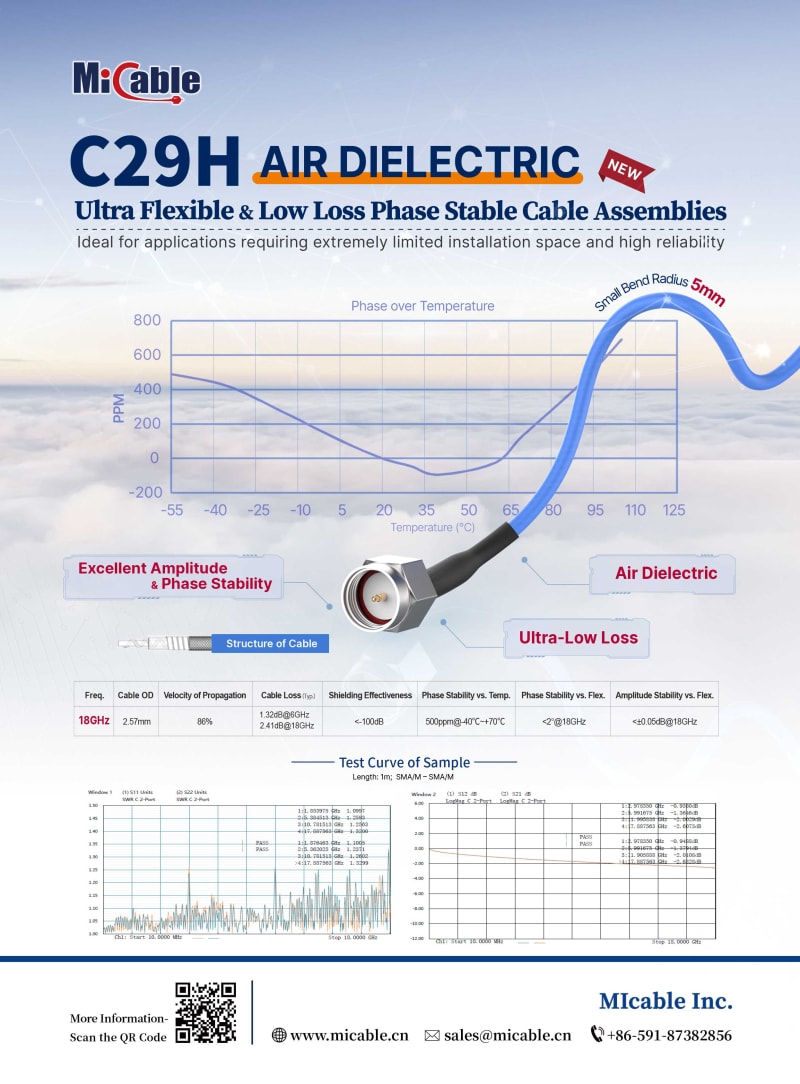 MIcable C29H air dielectric ultra-flexible & low loss phase stable cable assembly uses air as the dielectric, which is the lowest loss .086 cable with the highest velocity of propagation in the market. It's ultra-flexible with a small bending radius of 5mm, and extremely stable in dynamic application environments in terms of amplitude, phase, and VSWR. it also has an excellent temperature phase stability of less than 500ppm change rate over the range of -40~+70°C. The product is suitable for antenna servo systems, compact space connections, robotics/mechanical arms, and board interconnections, etc., and especially for applications requiring low loss and high amplitude-phase stability.