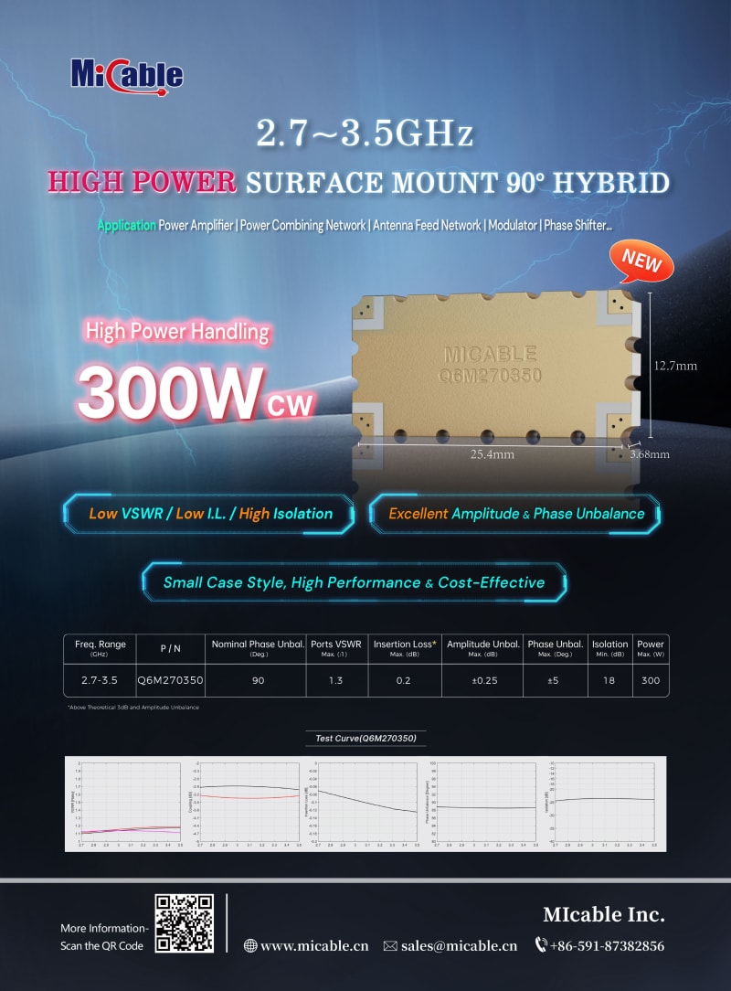 Mlcable just released the new 0.5~1GHz high power drop-in 90° hybrid. It has low insertion loss (0.25dB Max.), excellent VSWR (1.25:1 Max.) , extremely good amplitude unbalance (±0.55dB Max.) & phase unbalance (±5° Max.) , high isolation (20dB Min.) and 400W power handling capability with excellent stability and heat dissipation ability in a small package. It is suitable for power amplifier, power combining network, antenna feed network, modulator and phase shifter applications.