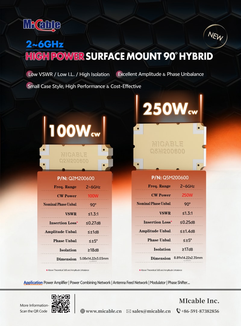 Mlcable just released the new two models of 2~6GHz high power surface mount 90° hybrid. With CW power handling capability of 100W and 250W. It has low insertion loss, excellent VSWR ≤1.3:1, extremely good amplitude & phase unbalance, high isolation, excellent stability and heat dissipation ability in a small package. It is suitable for power amplifier, power combining network, antenna feed network, modulator and phase shifter applications.