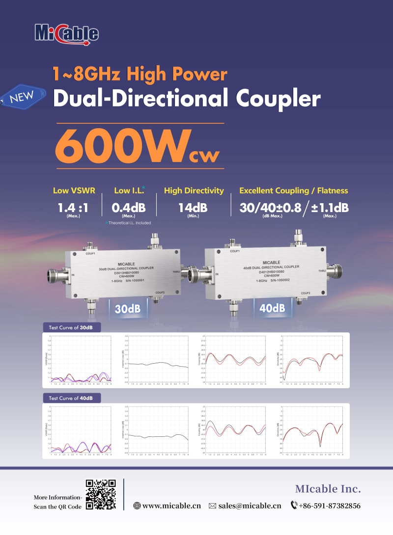 MIcable 1~8GHz 30/40dB high power dual-directional couplers has DC pass capability. They have excellent main line / coupling VSWR (1.4:1 Max.), low insertion loss (0.4dB Max.), excellent coupling (30/40±0.8dB Max.) & flatness (±1.1dB Max.), high directivity (14dB Min.) and 600W CW power handling capability. They can be widely used in 5G, testing, instrumentation, power amplifier, transmitter and other fields.